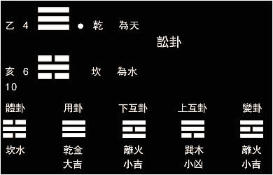 依照传统式卦变基础理论,这种卦是由遁卦变来,遁卦九三爻与六二爻互换部位而成。即由艮卦而变为坎卦,内卦由原先的艮卦变为了坎卦,和原先的外卦乾,一块儿生成以便(坎再下,乾在上)的重卦,因此被称作讼卦。讼卦,代表了历史人文社会发展1个常态化,就是说人情汹汹,争议持续,起诉绵绵不绝,最能体现不和的征候。